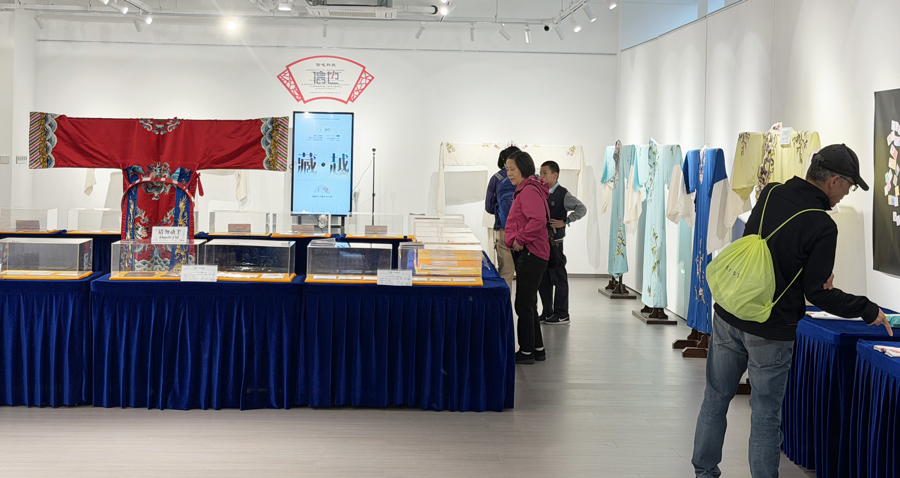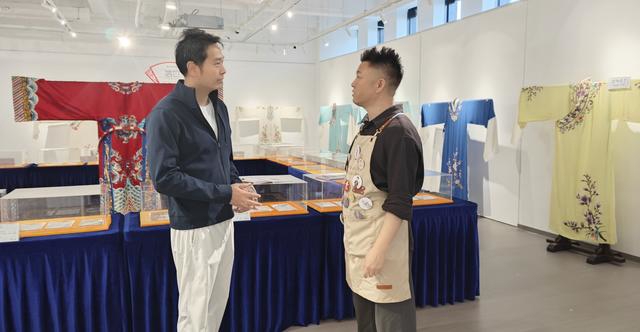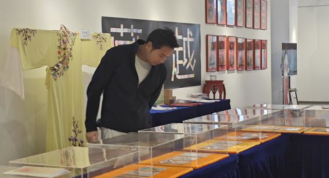 展厅中间与两侧陈列的非遗纯真丝手绣戏服,是越剧艺术的鲜活文化符号。每一针每一线都凝聚着对传统技艺的敬畏与坚守,泛着粼光的雅致面料让参观者纷纷惊叹,精湛的绣工更令人折服。此刻,岁月的静谧与美好在此交融,让人真切触摸到历史的韵味与温度。作为非物质文化遗产的重要组成部分,这些戏服既映照着越剧艺术特定阶段的审美风尚,也承载着剧种的艺术精髓。