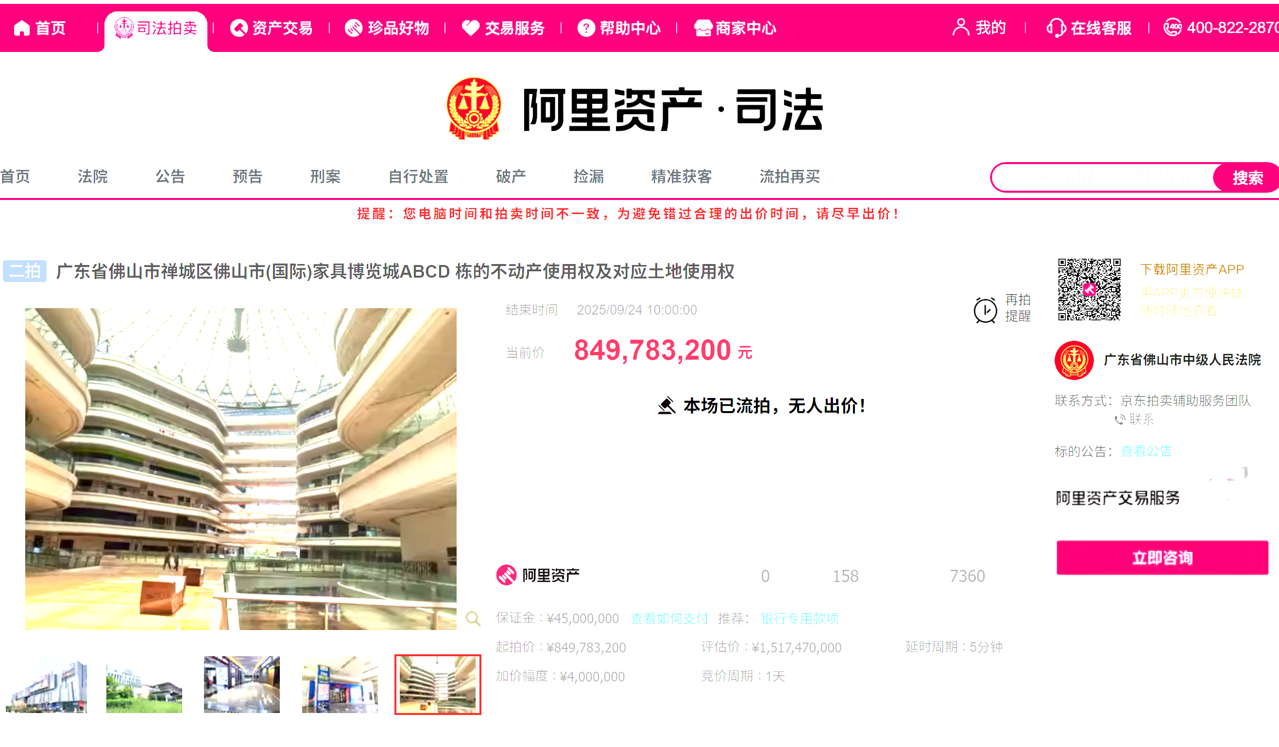 9月23日,佛山国际家居博览城以约8.5亿元的起拍价开启第二轮司法拍卖,其间,7359次围观尊享配资,终因24小时无人出价而流拍。