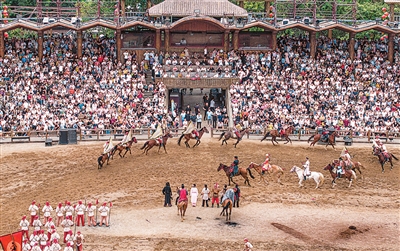 游客在万岁山武侠城观看实景演出《三打祝家庄》倍操盘。 景区供图