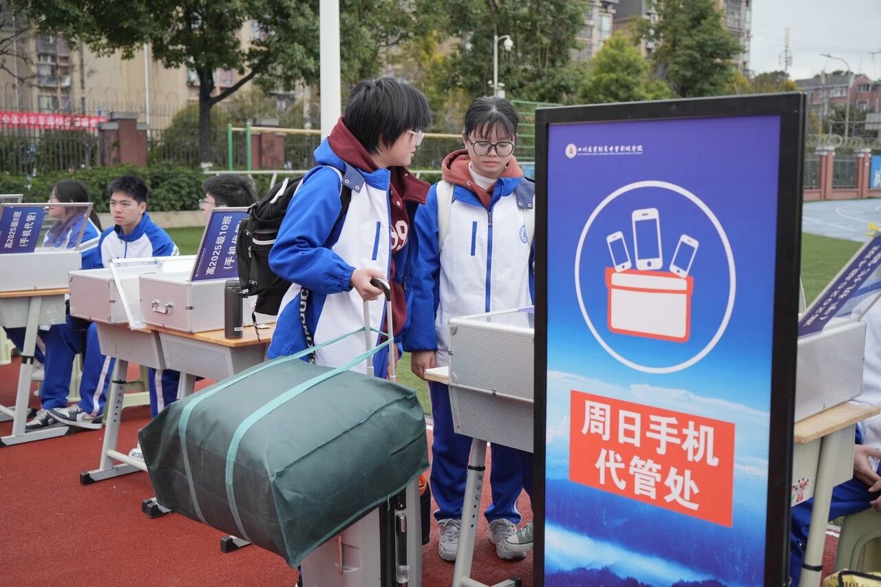 在四川大学附属中学新城分校,大多数同学们踏入校门,首先走向的是校门旁的手机管理处,自觉有序、从容将手机放置统一保管箱。走进教室,学生们积极主动、分工协作,擦窗扫地、整理桌椅、清洁角落,之后再是交作业、领新书,流程井然有序。