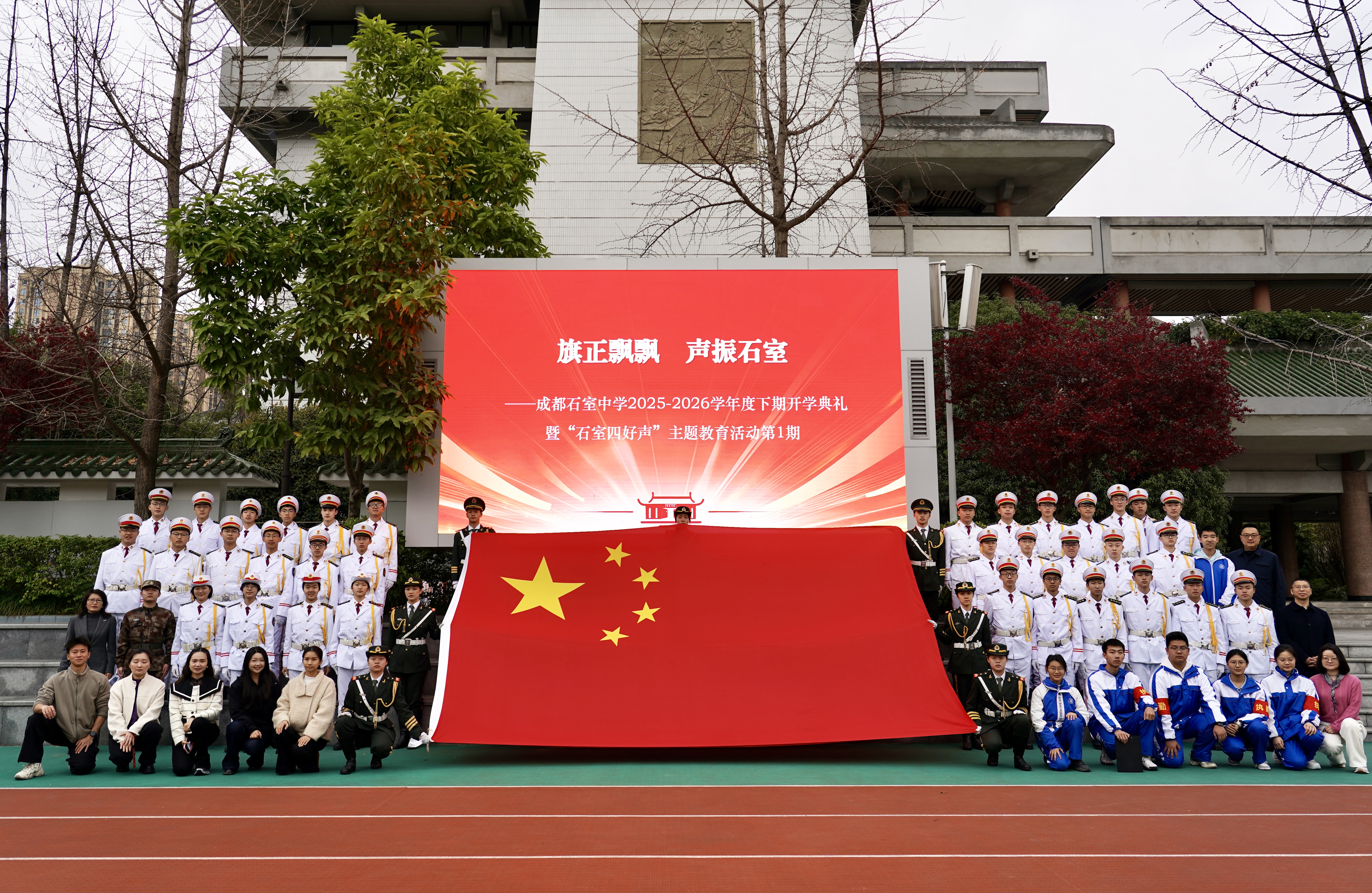 3月2日上午,成都石室中学迎来新学期第一周升旗仪式,一幕特殊的场景在校园内呈现。学校特别邀请了西南民族大学国旗护卫队到场,与同学们做列队展示,并进行主题分享。